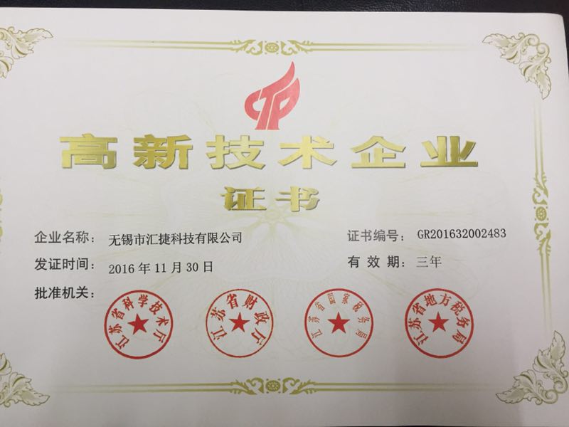 2016年11月30日,無錫市匯捷科技有限公司順利通過國家高新技術(shù)企業(yè)認定,獲得高新技術(shù)企業(yè)證書。