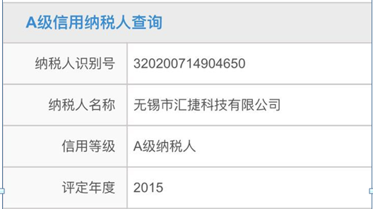 無錫市匯捷科技被評定為信用等級A級納稅人 2016-03-14 近日,無錫市匯捷科技有限公司被無錫市國家稅務局和無錫市地方稅務局聯合評定為2015年度A級納稅人稱號。 這是稅務機關對公司在稅務登記、納稅申報、賬簿憑證管理和稅款繳納等方面的肯定,我司將再接再厲,誠信經營,依法納稅,確保各項經營可持續發展。