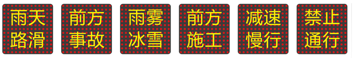 內置固定警示語句:1.雨天路滑 2.前方事故 3.雨霧冰雪 4.前方施工 5.減速慢行 6.禁止通行
